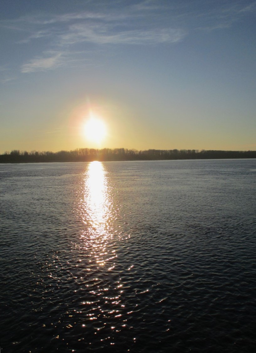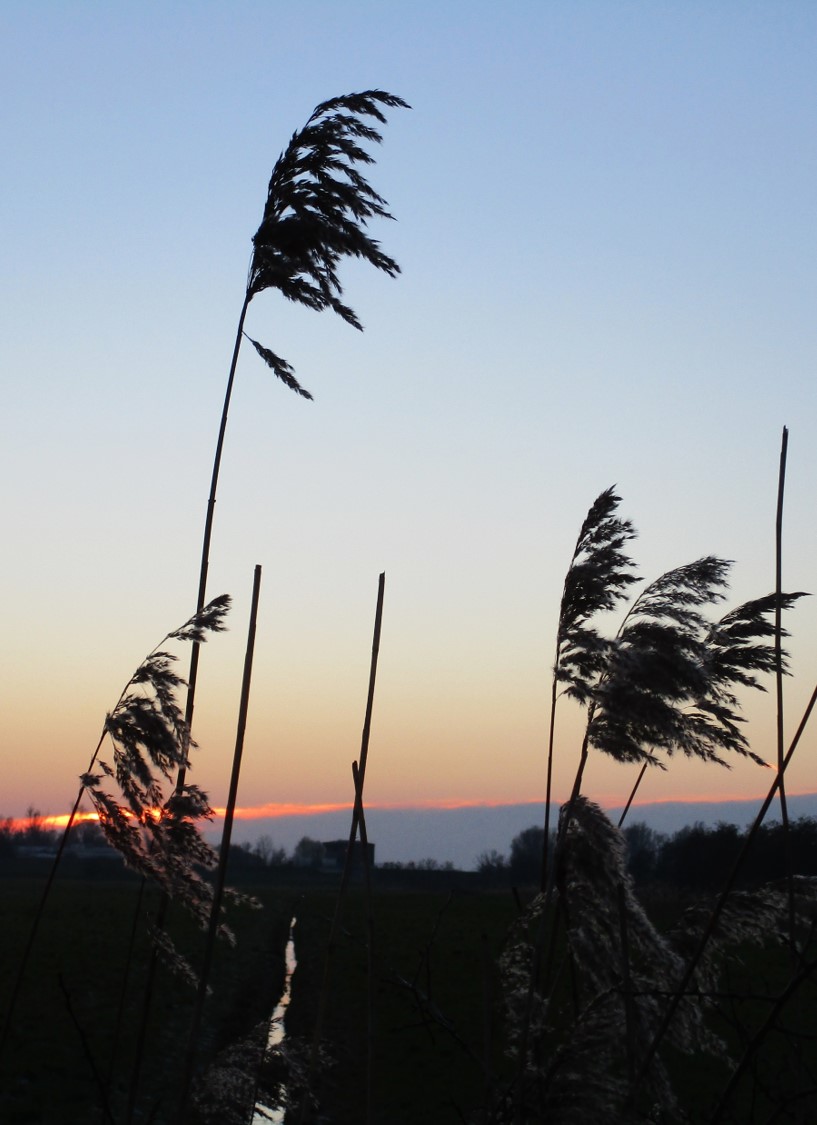 Abschied für heute – die Sonne ist hinter einer Wolkenbank verschwunden. Reet biegt sich im Abendwind. Erklärung zur hellen Linie: Auf der Marschwiese wurden Entwässerungsgrüppen Nord-Süd gezogen (der „Kasten“ am Horizont ist das auf dem Deich stehende Sturmflutsperrwerksgebäude Wedeler Au).