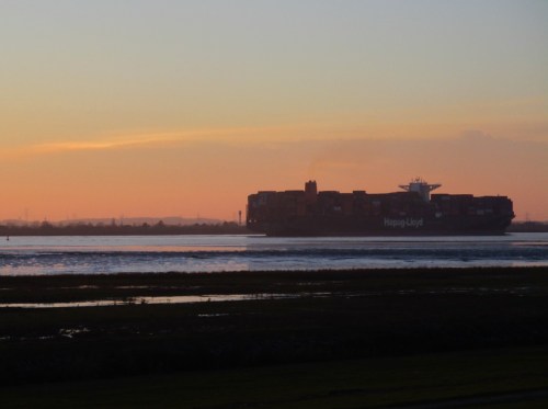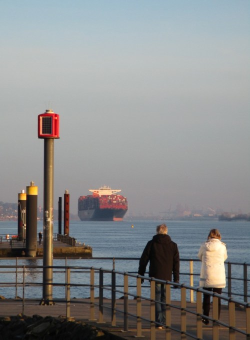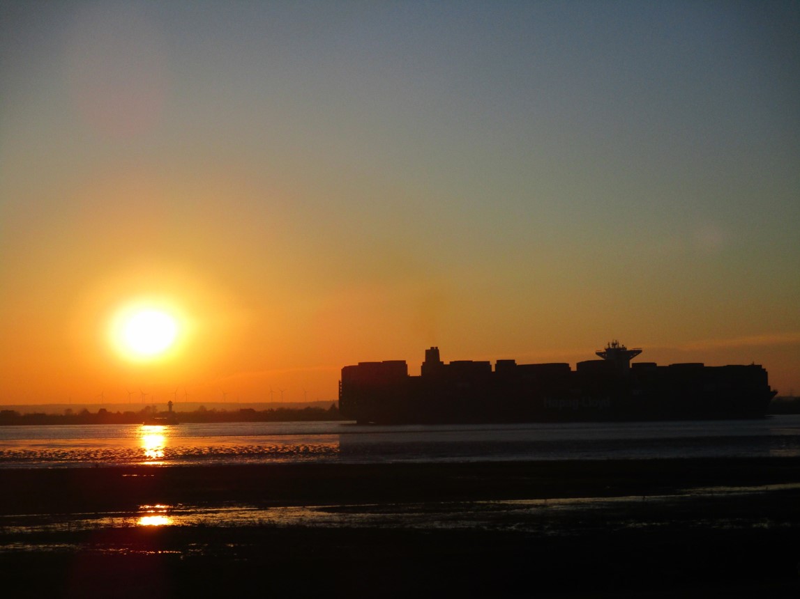 Derweil zieht der Containerriese weiter gen Nordsee – man beachte die Größenverhältnisse, Schiff vorn, am Horizont die Stader Geest.