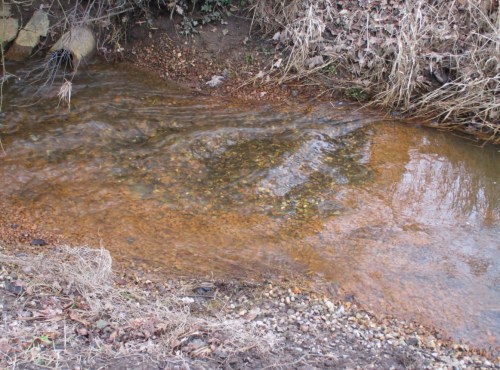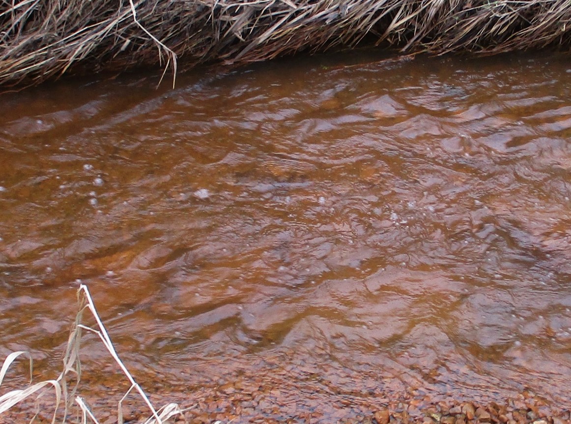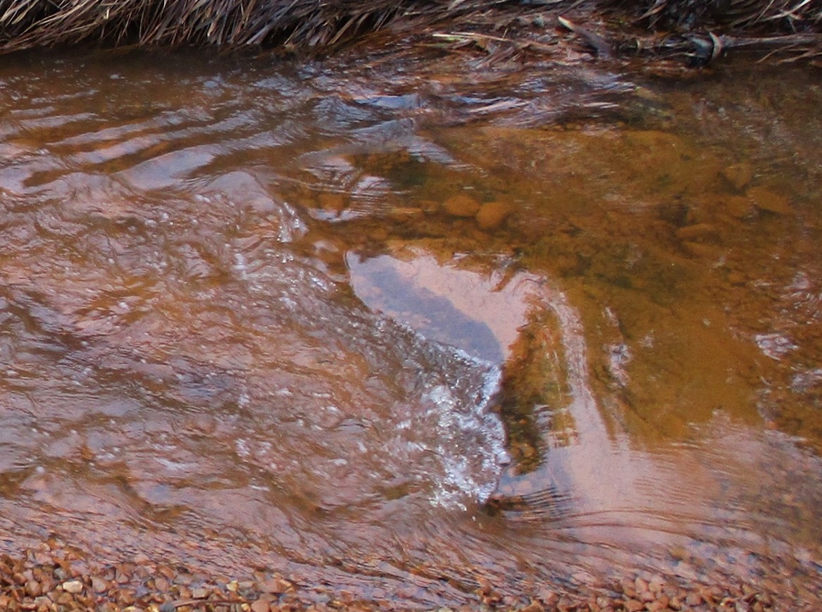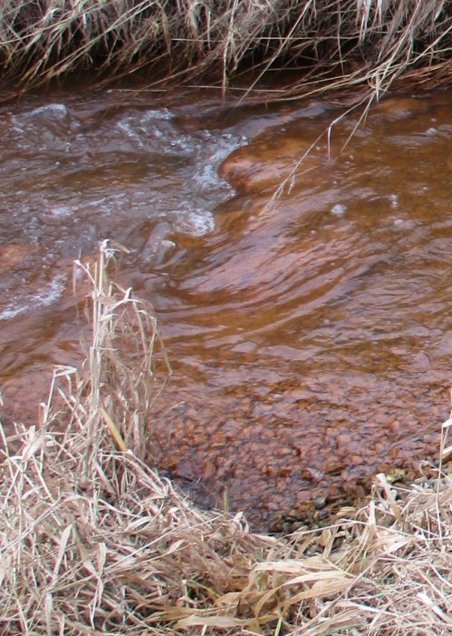 Bei frischer Umsetzung von gelöstem zu ausgefälltem Eisen, Ocker, kann so ein Bach ganz schön unnatürlich farbig anzusehen sein. Start orange, in weiterer Oxidation dunkelnd Richtung dunkelbraun. Begleitet eine Menge Mangan das Eisen, kann die Endfärbung der Oberflächen von Sohle und Ufer Richtung schwarz gehen.