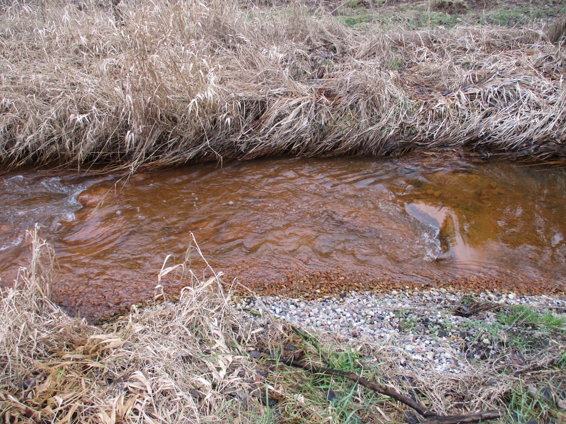 Angesichts unserer intensiven Bodennutzung bis in empfindliche Bereiche (wir haben nach wie vor kein Bodenschutzgesetz, das Boden in seiner Komplexität schützt!) führt großräumige, tiefe Entwässerung mit ihrem schnellen Ableiten jeglichen Wassers in speziellen Situationen zu direkten Einleitungen belasteten Wassers und zu hohen Frachten von Eisen. Bei hoher Turbulenz und rauer Struktur von Gewässersohle und -ufer fällt das Eisen recht schnell aus, bachab liegende Strecken sind entlastet. Eisen im Bach bei fehlender Turbulenz kennzeichnet diesen durch Waschmaschinenwasser-grau-milchigen Eindruck. In Ruhebereichen bilden sich an der Gewässeroberfläche Öl-artig wirkende Kahmhäute. Durch Berühren ist zu unterscheiden, um was es sich handelt. Bricht der „ölige“ Film, handelt es sich nicht um Öl-, sondern um Eisenbelastung des Gewässers.