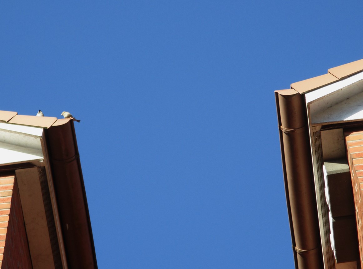 Herr Spatz startet, auf die gegenüberliegende Dachrinne zu.
