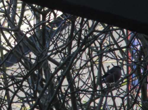 Da turnt eine Gruppe Dompfaffen im Geäst, die Vögel profitieren sicherlich von nachbarlichem Futter – hier ein Weibchen.