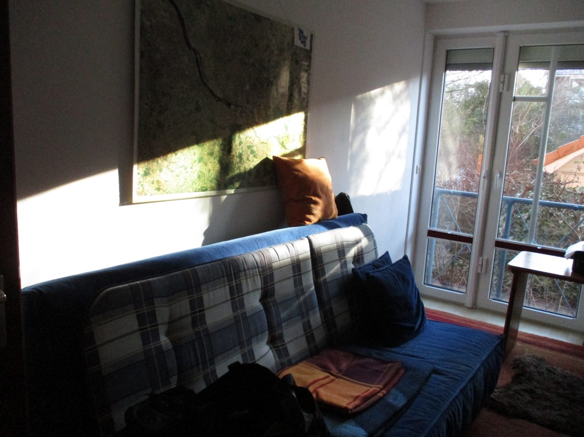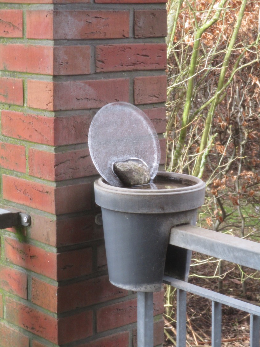 Vorn, unten rechts ausserhalb des Fotos, ist eine Nisthilfe am Balkongeländer angebracht.