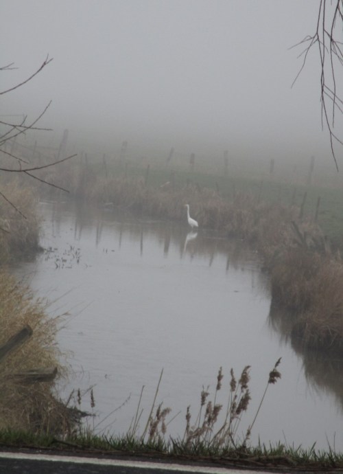 Marschgraben Lanner, weiss leuchtet ein Silberreiher – mit Spiegelung.