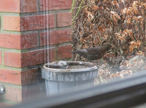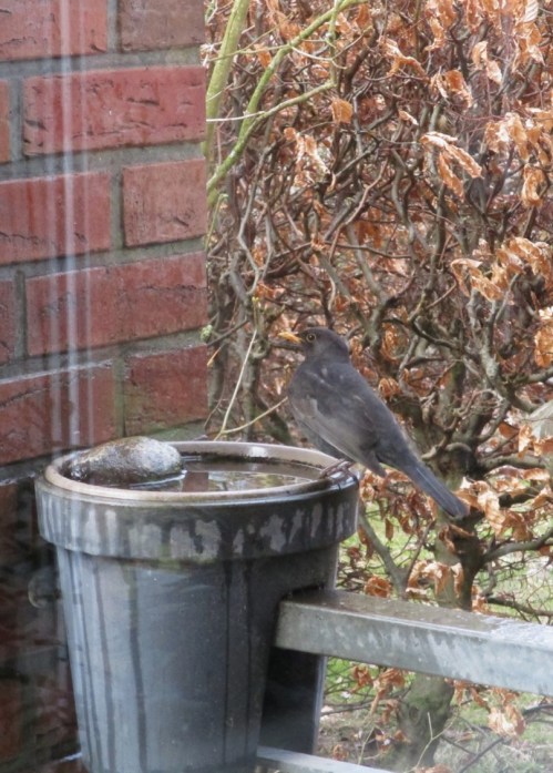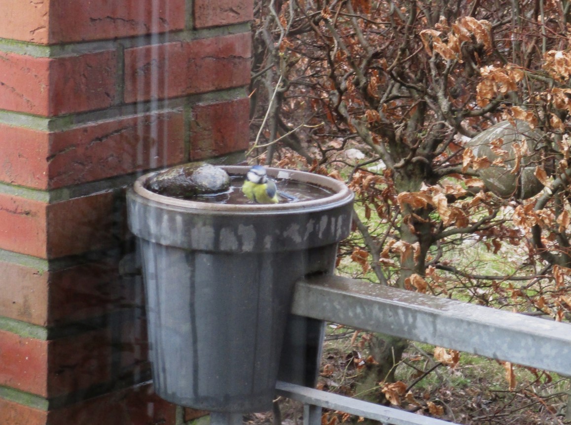 Wie die Amseln sorgen Blaumeisen, auch Rotkehlchen, für ordentlich Wasserumwälzen, -rausspaddeln. Man wundert sich, wie geradezu inbrünstig sich Rotkehlchen und Blaumeisen dem Herausschaufeln großer Wassermengen widmen. (Erwarten wir bei den Amseln nichts anderes? Jedenfalls lassen sich die beiden genannten Arten nicht lumpen im Vergleich zu den größeren Gefiederten.)
