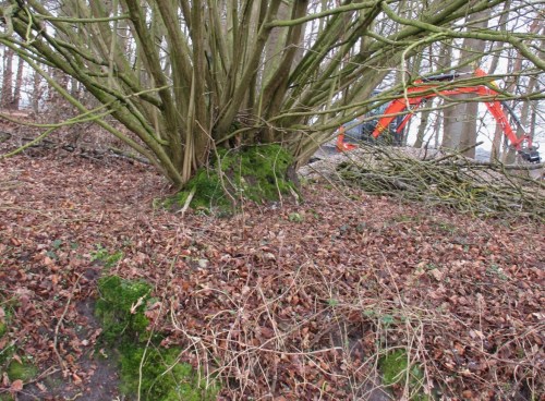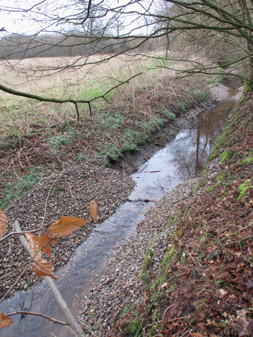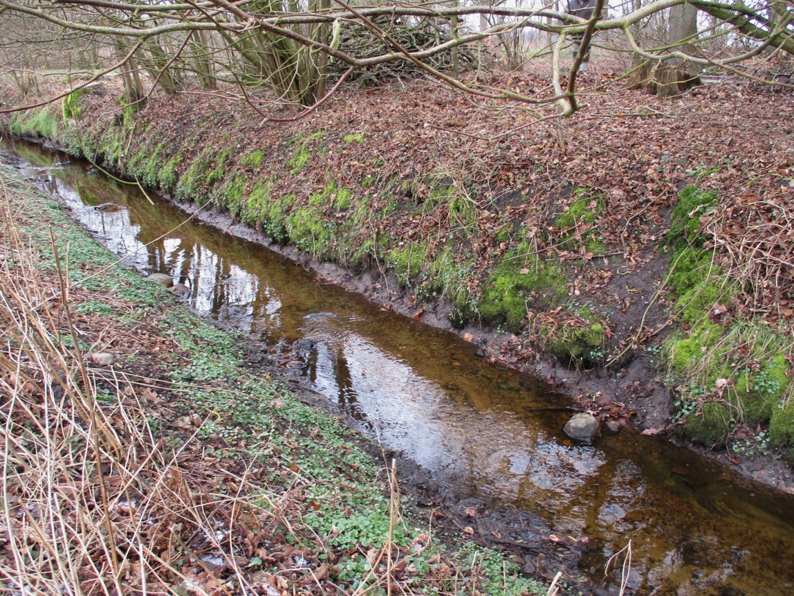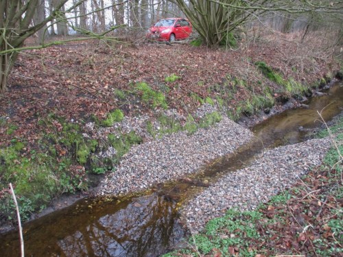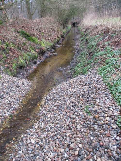 Lücken zwischen dem Busch- und Baumbestand sind geeignete Stellen, direkt vom Weg her den strukturarmen Bach zu bekiesen.