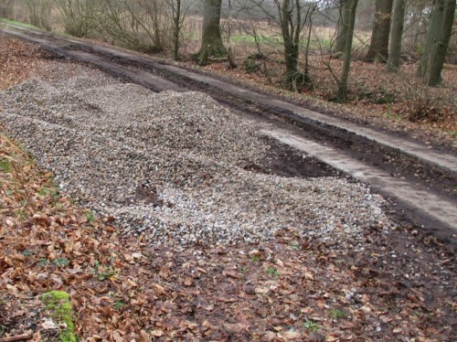 Da liegt, unmittelbar neben dem Zweistreifenweg, auch schon der erste Kies bereit.