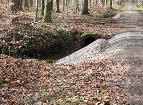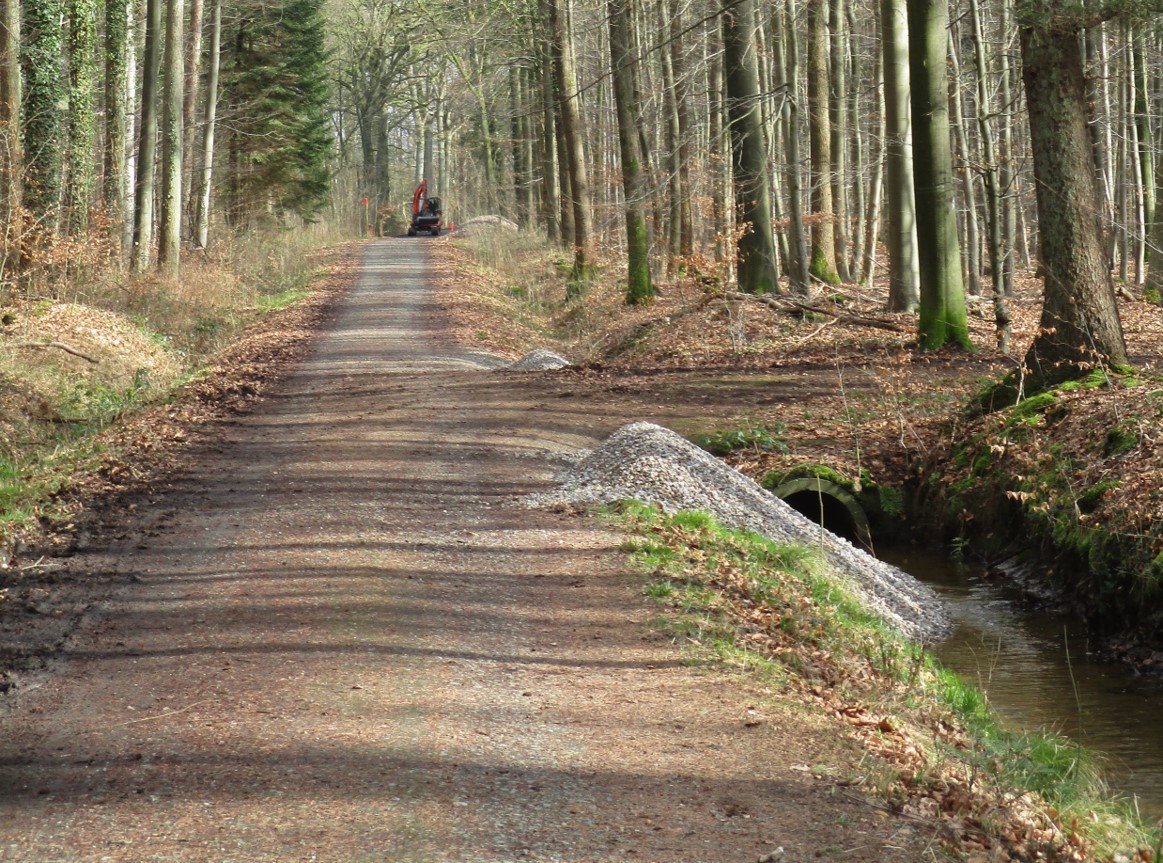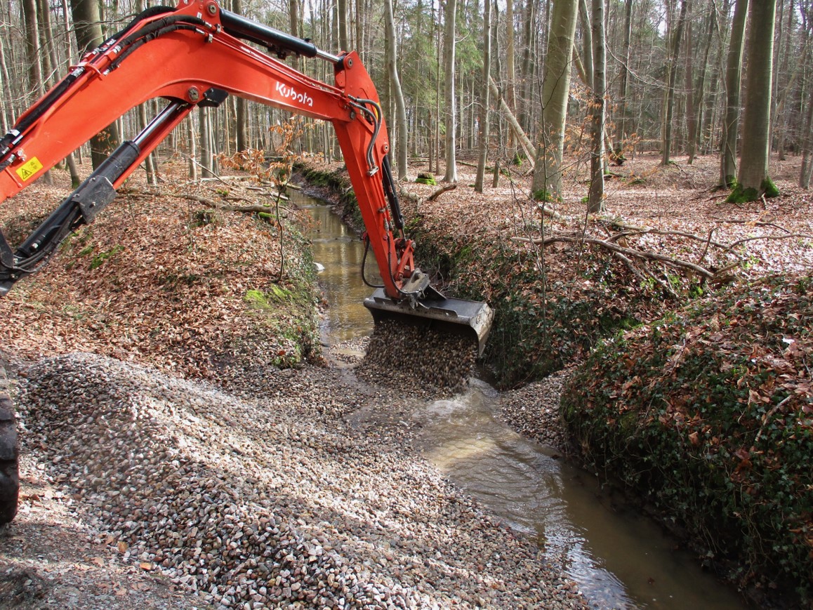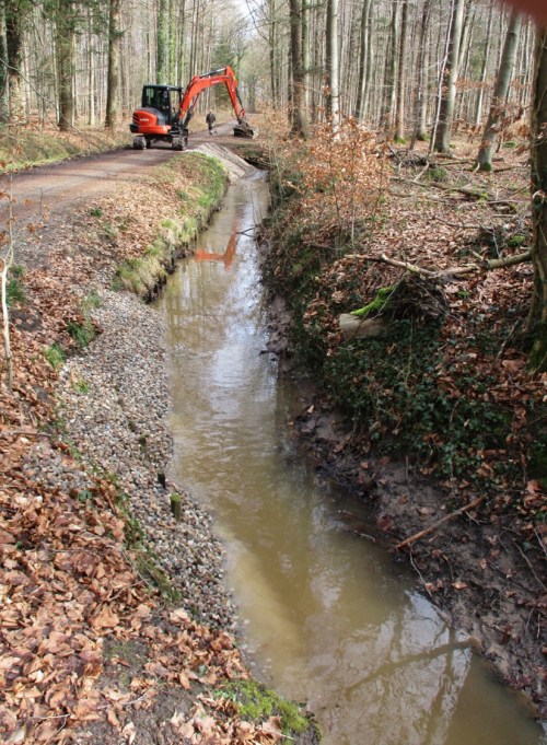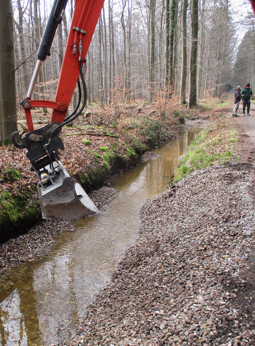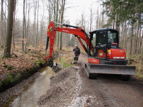 Angesichts des passend liegenden Materials kann der erodierte Anstrom des Wegs schnell entschärft werden. Ein den Wald extrem entwässernder Uferanstich ist im Austritt ebenfalls verbessert.