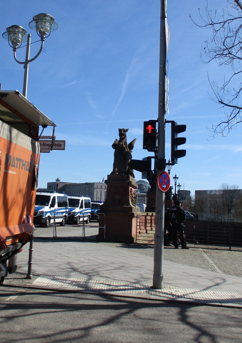 Auf dem Weg zum – fast – Berlin-Start-Ritual, Mittagessen. – Großer Aufmarsch, Staatsbesuch und Ministertreffen der Länder zeigen ihre Begleitsicherheiten.
