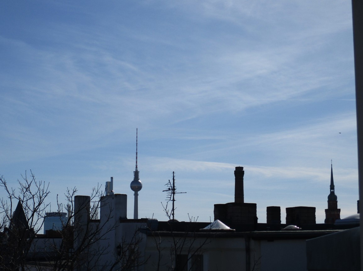 Mutter (Geburtstag voraus!) und Kind auf dem Nachhauseweg von der Schule getroffen. – Wir sind angekommen. Hoch oben über den Dächern von Berlin.