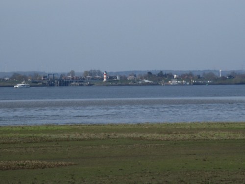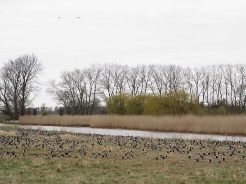 Blick vom Sperrwerk Wedeler Au auf die – noch ziemlich volle – Tide-Binnenelbe, lockere Nonnengansformation vor frühlingsgelben Trauerweiden.