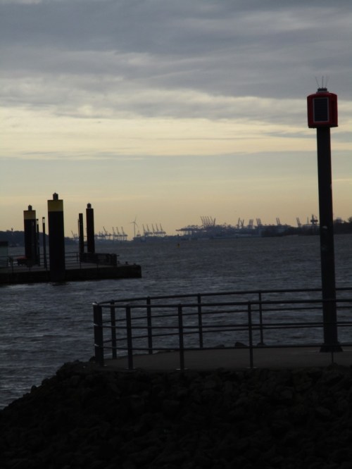 Blick vom Hafensüdende gegen den strammen Wind (und das Morgenlicht) – am Horizont Portalkräne der Containerhäfen und -kais im Hamburger Hafen.