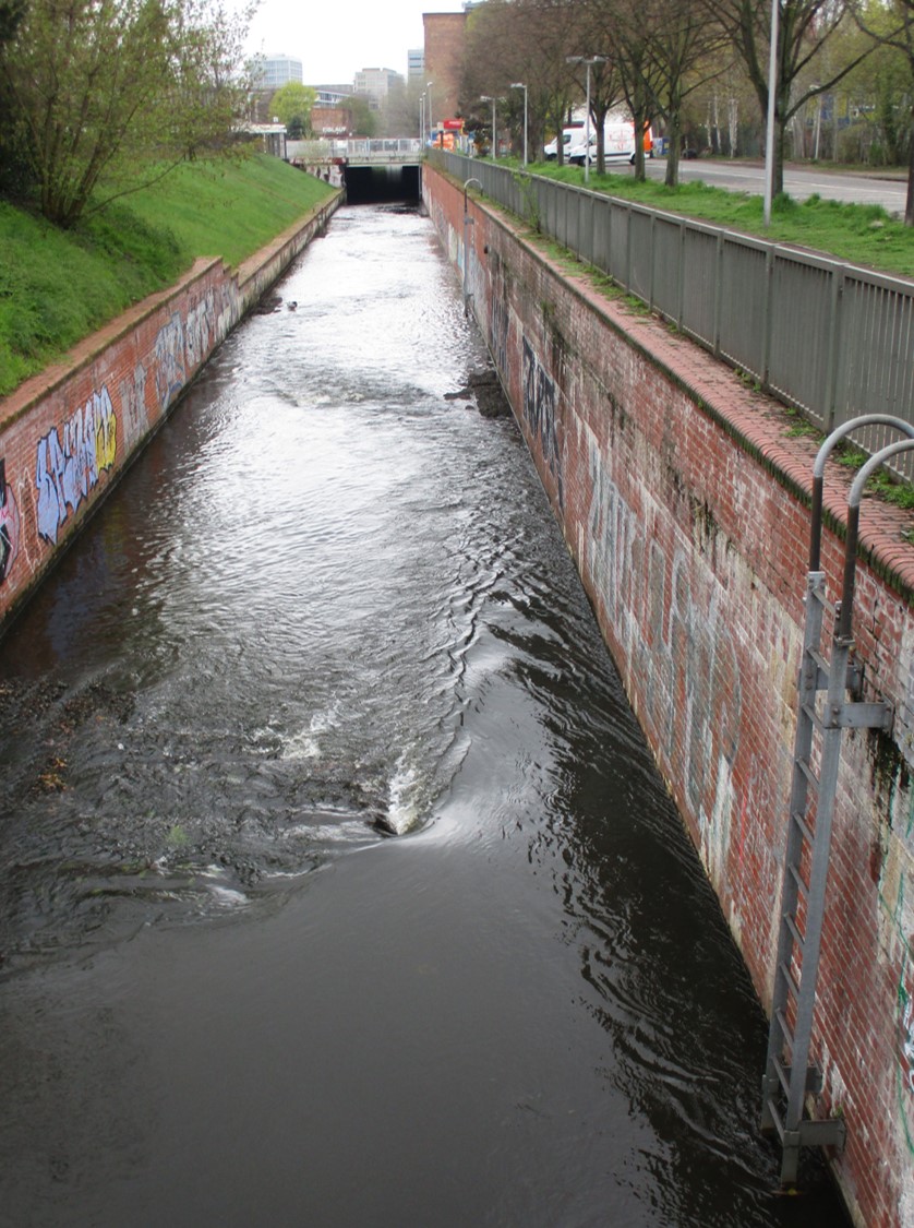 An der Nordpanke angekommen, Blick Richtung Mündung in den Nordhafen – die bekannten, fast noch neuen Mäander.