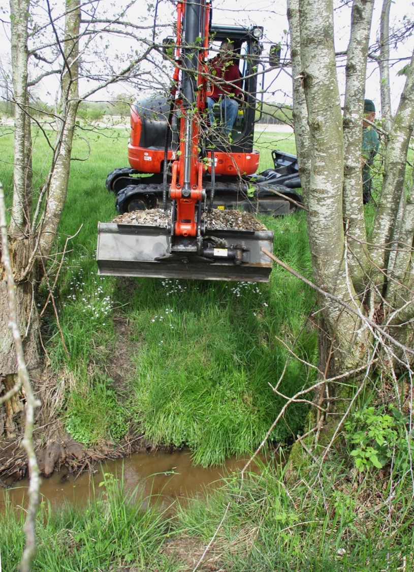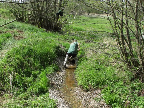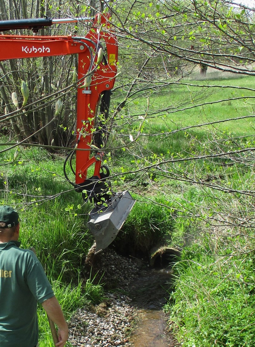 Der Bagger naht, wir gehen ein paar Dutzend Meter bachauf.