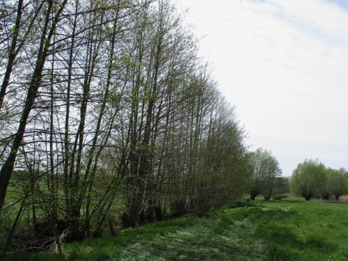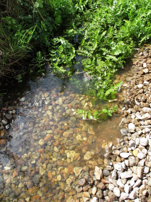 Während per Bagger der Schüttplatz der oberen Strecke steinfrei geputzt wird – es soll ja kein Mähwerk Schaden nehmen, streben wir Fußvolk der mündungsnahen zweiten Strecke zu. Bis der Bagger kommt, nutzen wir die Gelegenheit, die Besiedlung unterscheidbarer Teilbereiche und des vor zwei Monaten erstbekiesten Stücks zu untersuchen.