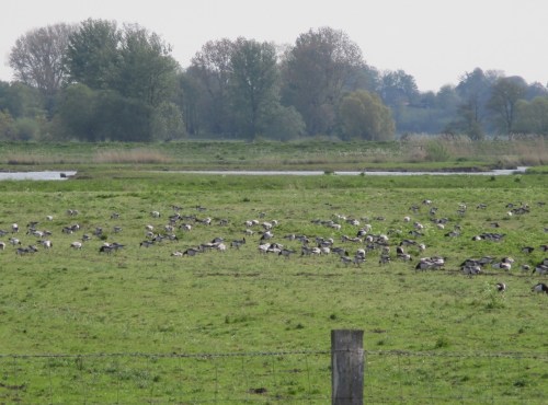 Hinterm Elbdeich, querab NABU Vogelstation – es geht wohl auf den Rest. Kürzlich Ende April, rund ums Kiebitzfest, wurden noch mehrere ZehnTausend durchziehende Nonnengänse gezählt.