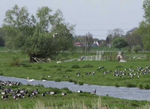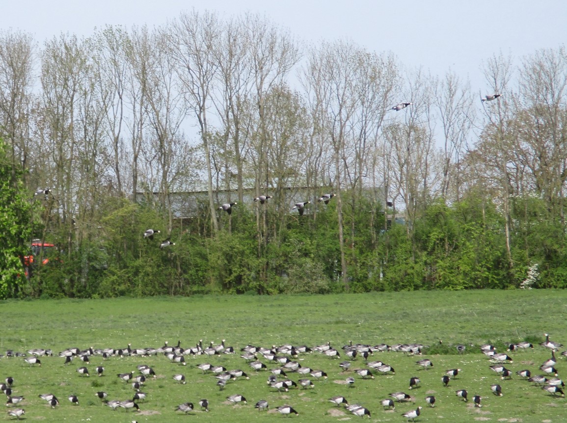 Neben der eben gezeigten Westgruppe gibt es eine Ostgruppe. Zu beiden fliegen Schwärme von Nonnengänsen von der Elbe her über den Deich zu.