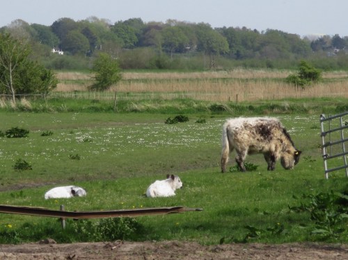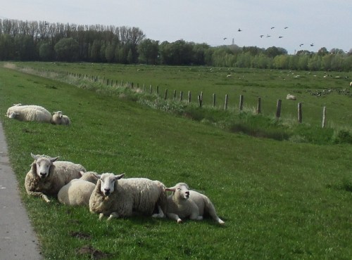 Erste Fohlen (nicht fotografiert) sind ebenfalls aufgetaucht sowie Lämmer einer von den Deichschafen abweichenden Rasse, die hier zwischen den Deichen grast.