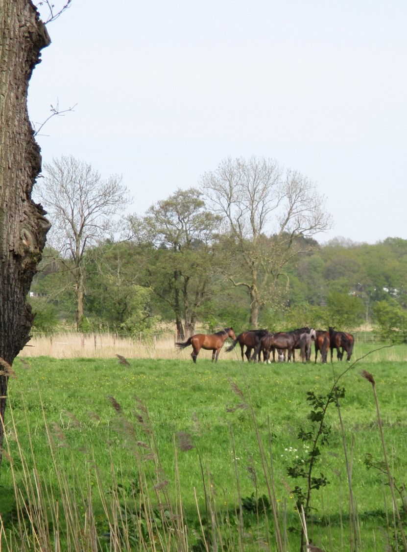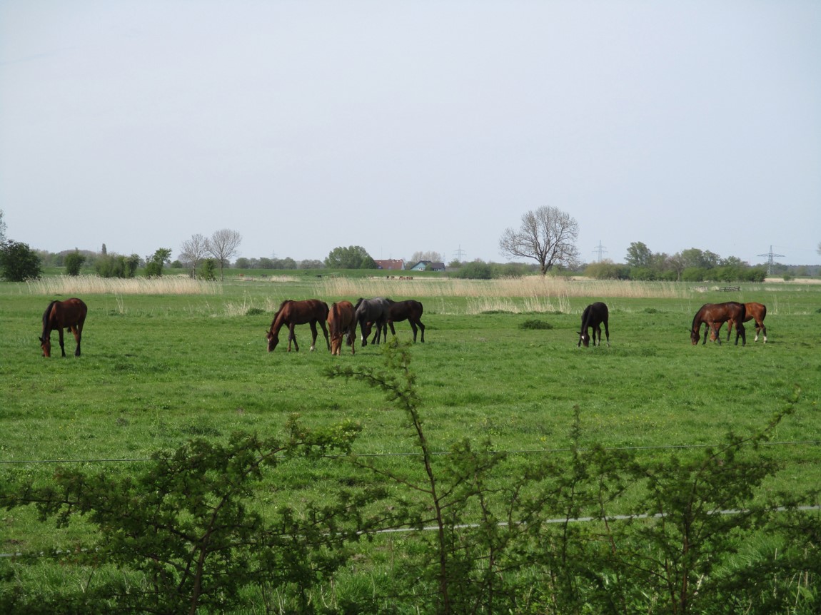 Interessant das Verhalten der Pferde – in lockerer Gruppe grasend im Windschatten der Idenburg-Eichenallee …