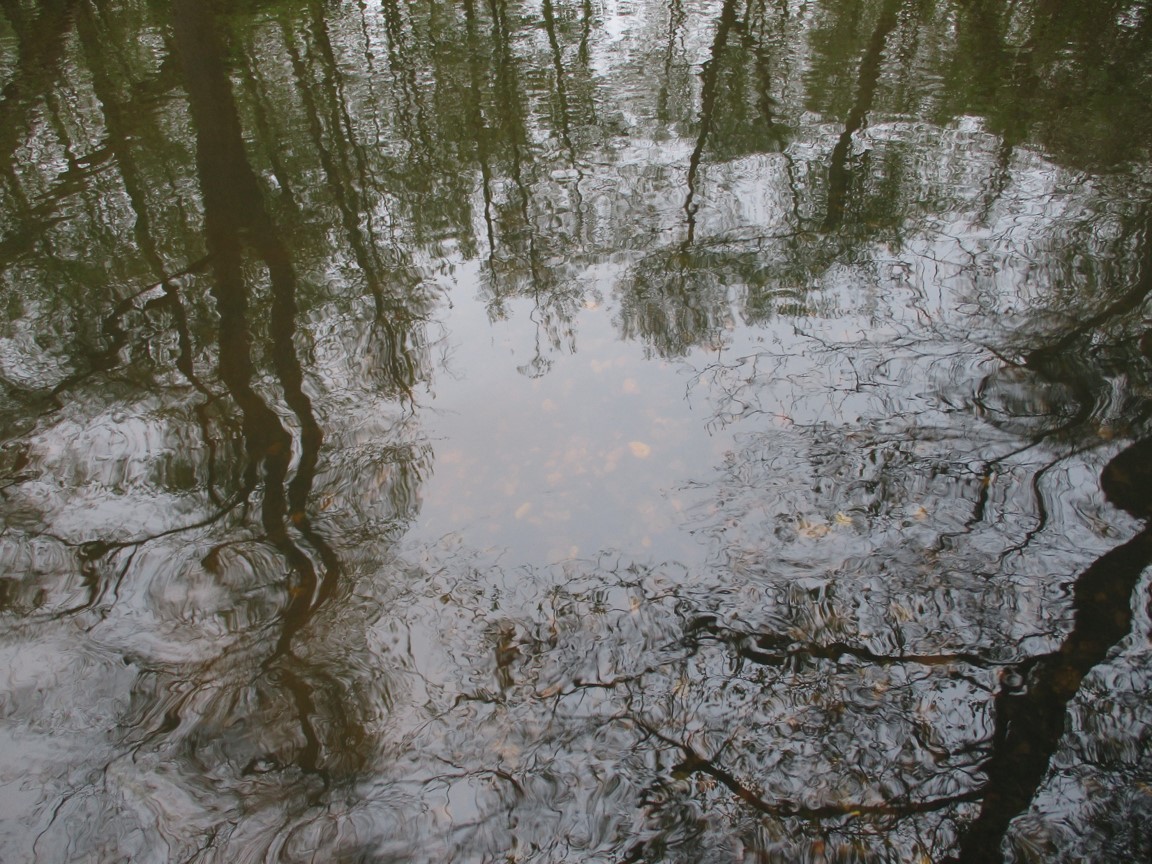 Fokussiert (die Digicam fokussiert die Baumspiegelung ringsum) – ganz klar: Laichbett, charakteristische Struktur im Kiesbett.