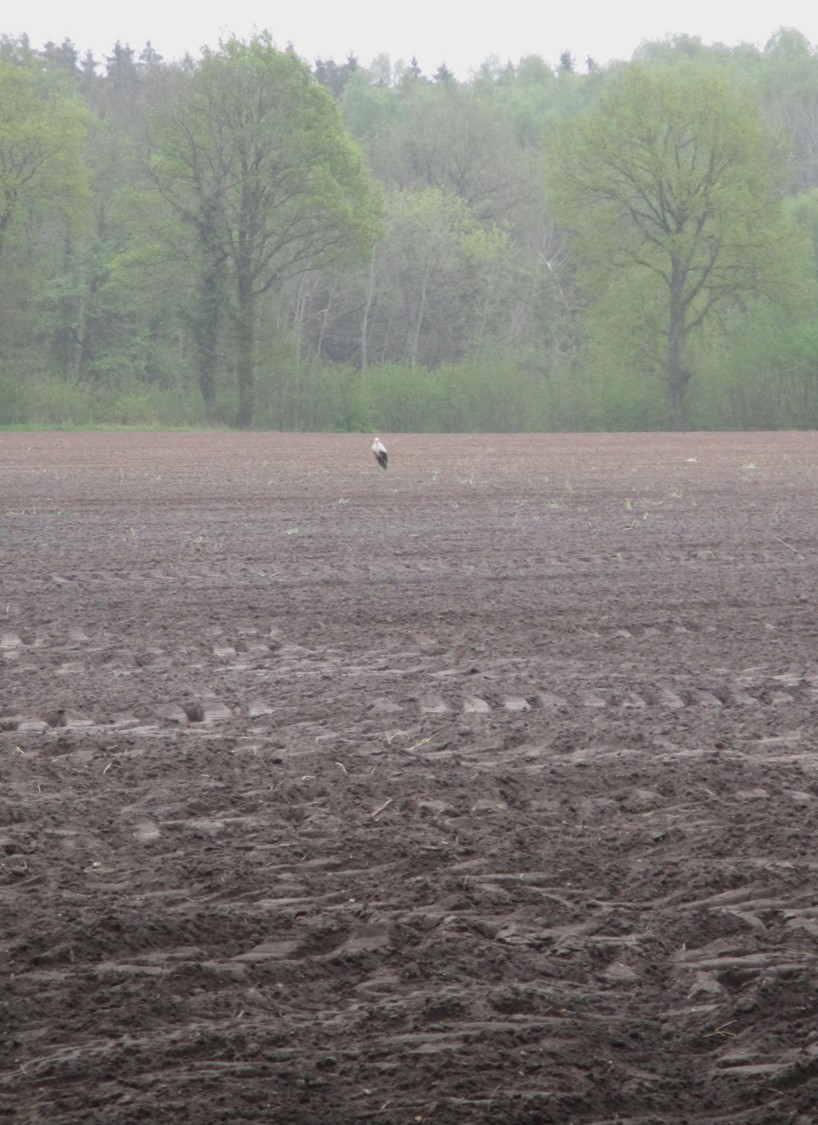Und es geht weiter … – Richtung Osterau Bad Bramstedt, vorbei an einem Weisstorch auf Acker, vor der Osterau-Aue.