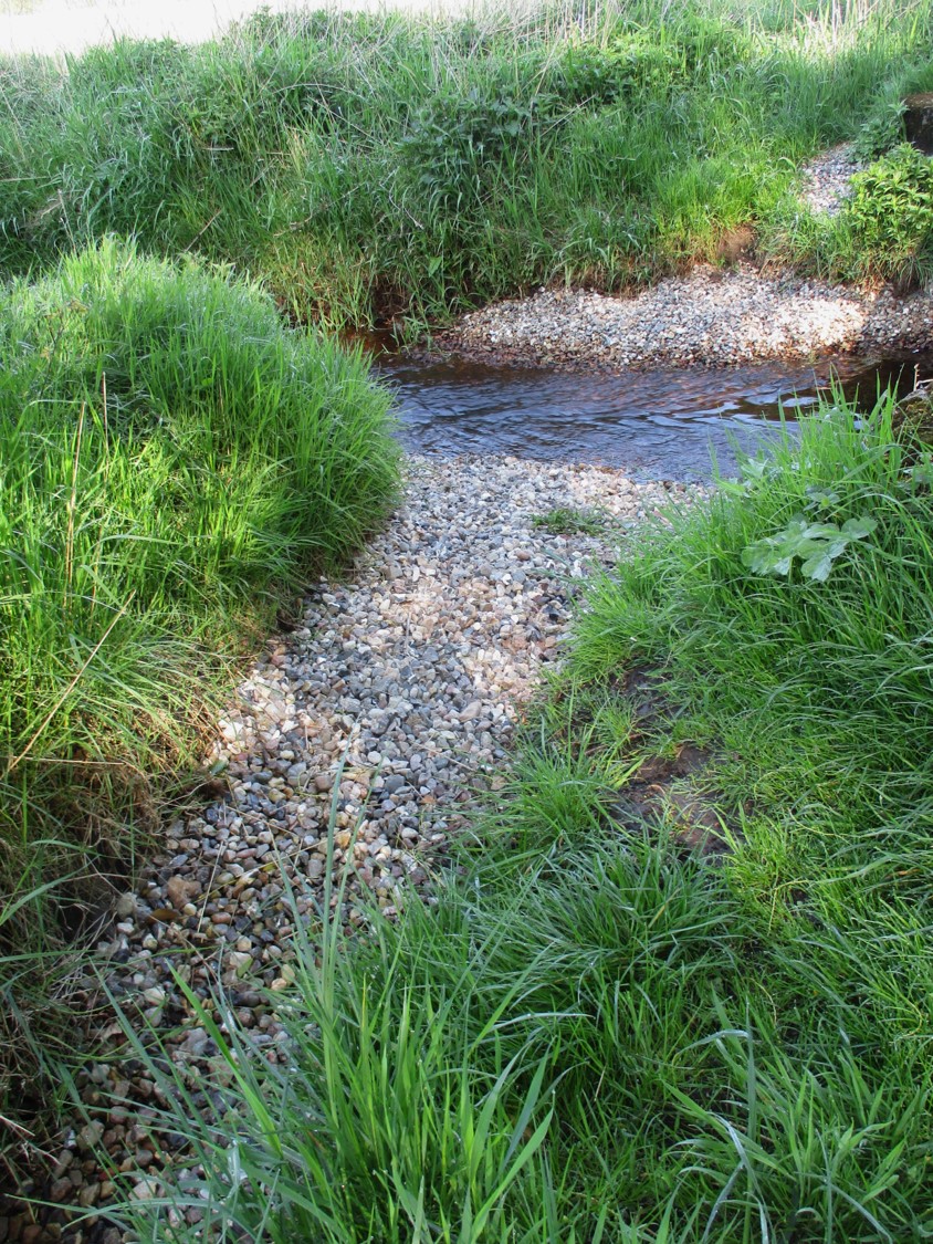 Blick bachauf – die Punktbekiesung an den 4 Überfahrtecken hat 2 Rauschen, Turbulenz entstehen lassen. Das Niedrigwasserbett ist profiliert.