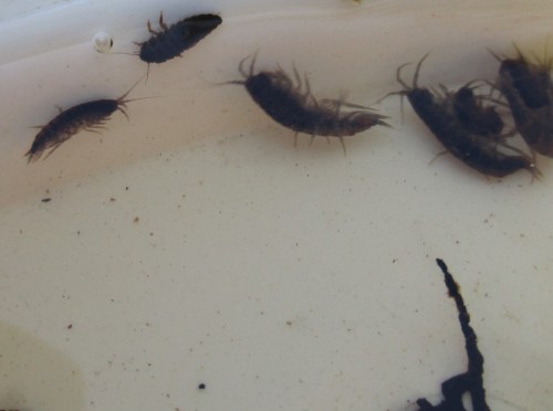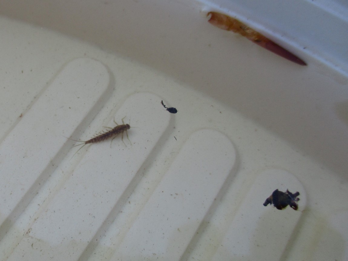 Neben den üblichen Verdächtigen findet sich hier eine ganz junge Larve der Großen Maifliege, Ephemera – nebendran eine Kriebelmückenlarve.