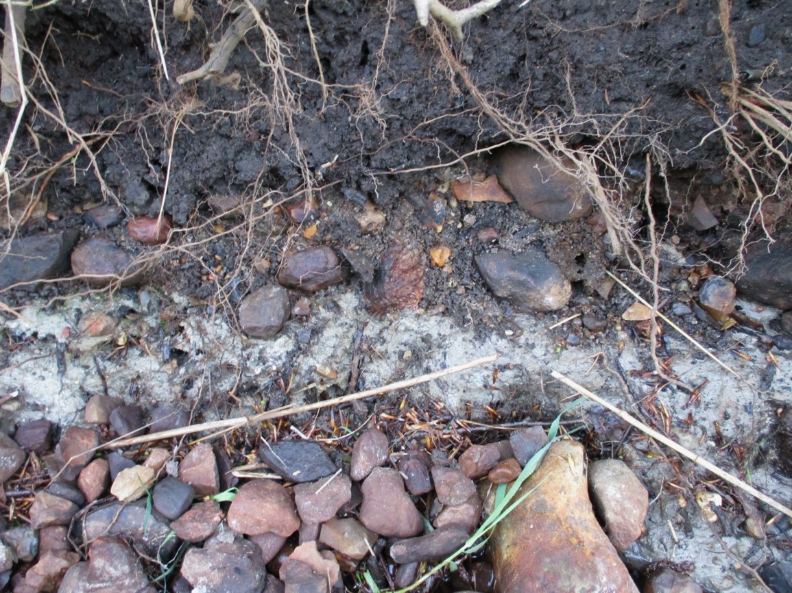 Kleiner Blick ins Ufer – oben organischer Wiesenhorizont, darunter eiszeitliche, steinreiche Moräne, lehmige Moränenschicht, darunter beginnt der Niedrigwasser-profilierende zugegebene Kies. Letzterer ist durch den Abfluss aus dem Himmelmoor (im Original pottschwarz) bereits rotbräunlich angefärbt.