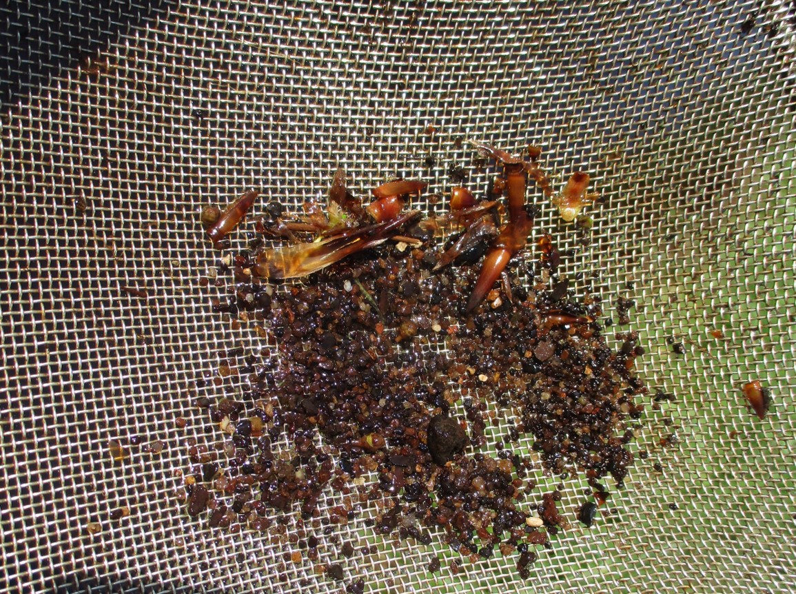 Sandflächenprobe, gespült – Grobsand und Feinkies, da sandbedeckt gewesen, ohne Leben, Spelzen der Buchenblätter.