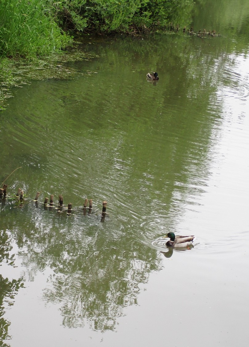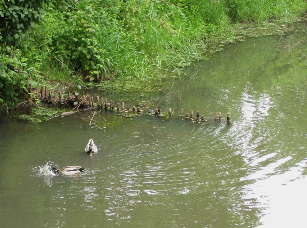 Hoch aktiv an den angesichts Überbreite und kaum Abfluss nur schwachen Strukturen sind Stockentenerpel sehr beschäftigt.