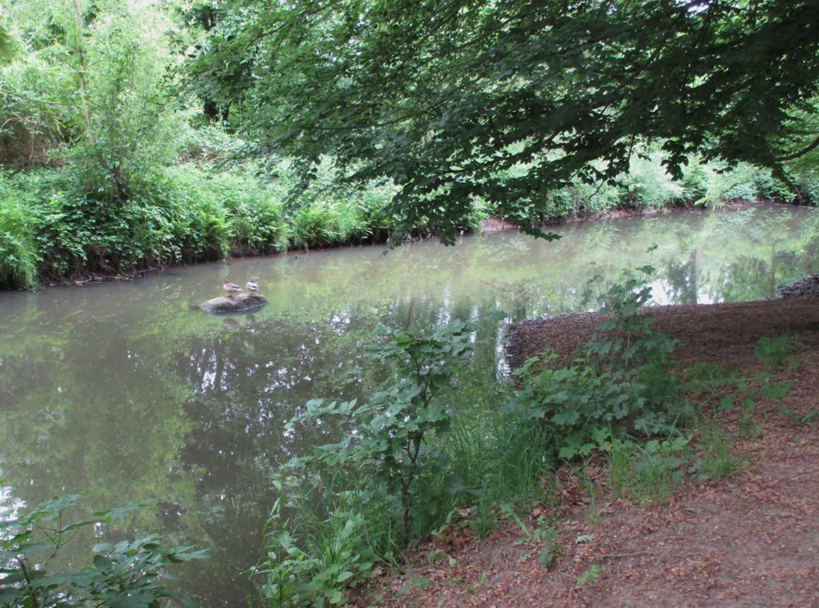 Und weiter geht`s, die Mühlenau bachab entlang, Richtung Bahnquerung. Neben dem Kies unter dem Buchenbogen querab Rosengarten sitzen zwei Enten.