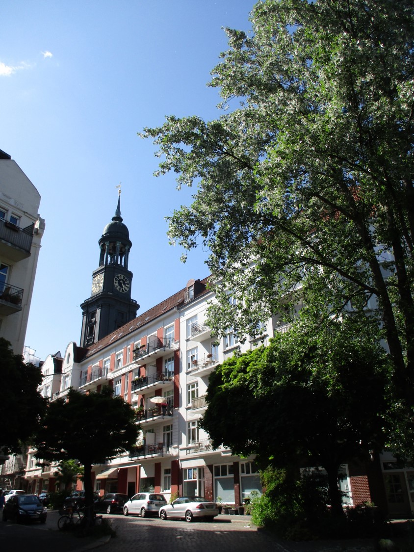 Von der Neanderstraße blicken wir gen Süden über die Ludwig-Erhard-Straße – der Michel guckt um die Ecke.