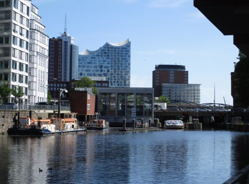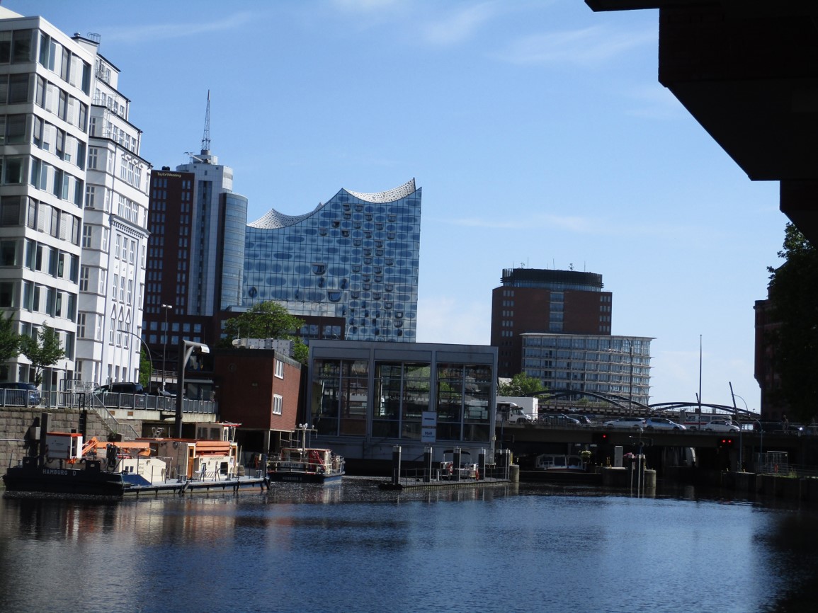 Blick südwärts über das Alterfleet auf die Schaartorschleuse – vom Binnenland über den Hochwasserschutz Richtung Elbe, mit ElPhi.