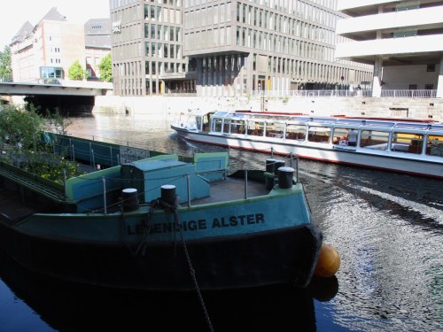 Das Touristenschiff passiert die „Grüne Schute„, Bildungstreff der Aktion Lebendige Alster.