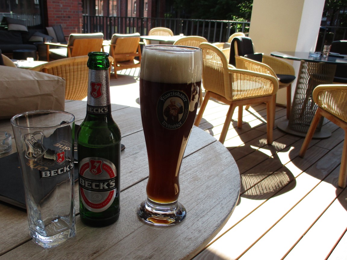 Schicke Terrasse zum Herrengrabenfleet – wir wählen Plätze im Schatten, je 2mal Hell und Dunkel im Foto: Situation und Getränk.