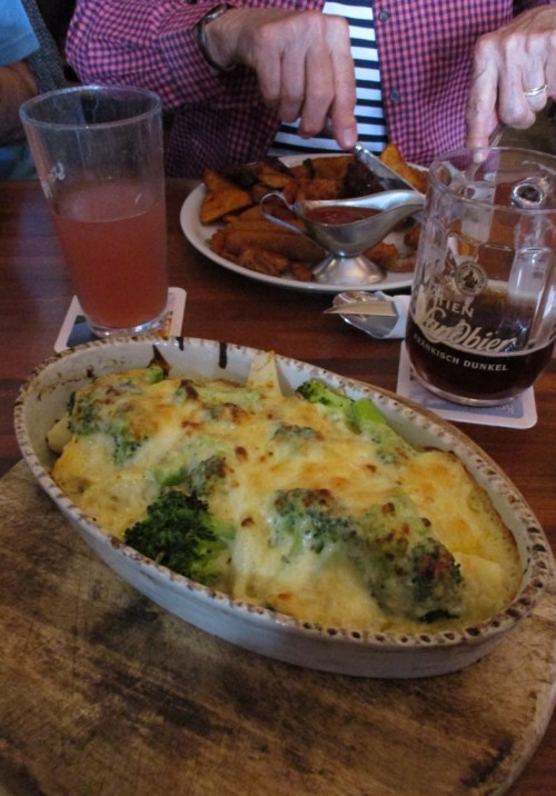 Wir sind dann doch lieber reingegangen … – Persischer Auflauf mit Blumenkohl, Broccoli, Walnüssen, Mandeln, überbacken, im Vordergrund.