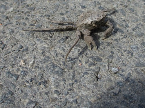 Abgesprungen – wer quert den Deichverteidigungsweg? Eine junge Wollhandkrabbe, mit Sand und Schlamm, sonnig festgebacken auf dem Panzer. Ich werfe sie ins am Boden feuchte Schilfröhricht (ja, ich weiss, die meisten hätten sie plattgetreten …).