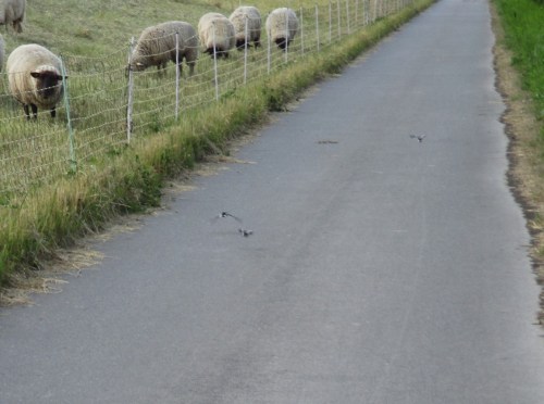 Erstauntes Schaf, gut beobachtend – wie die Wilden vollziehen die Bachstelzen mit Jungvolk waghalsige Flugmanöver. Nicht scharf zu bekommen.