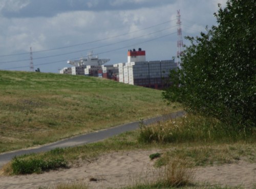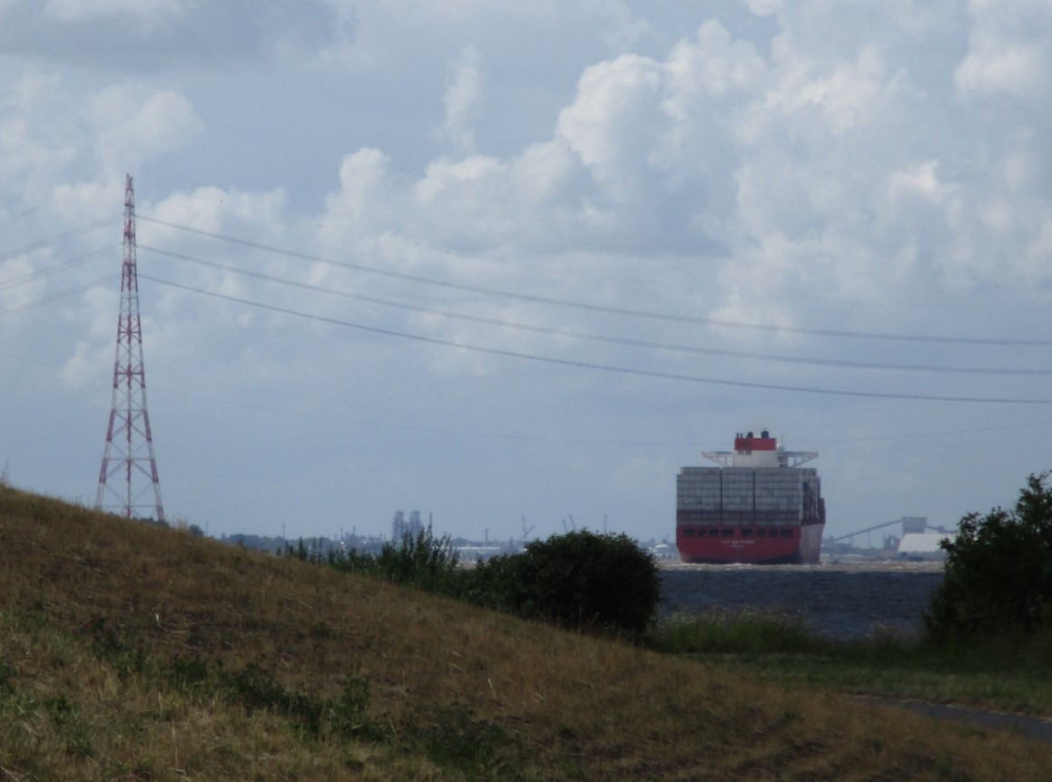 Da zieht der Containerfrachter seewärts, vor Stades Industriekulisse am Horizont.