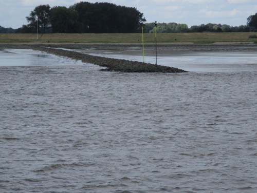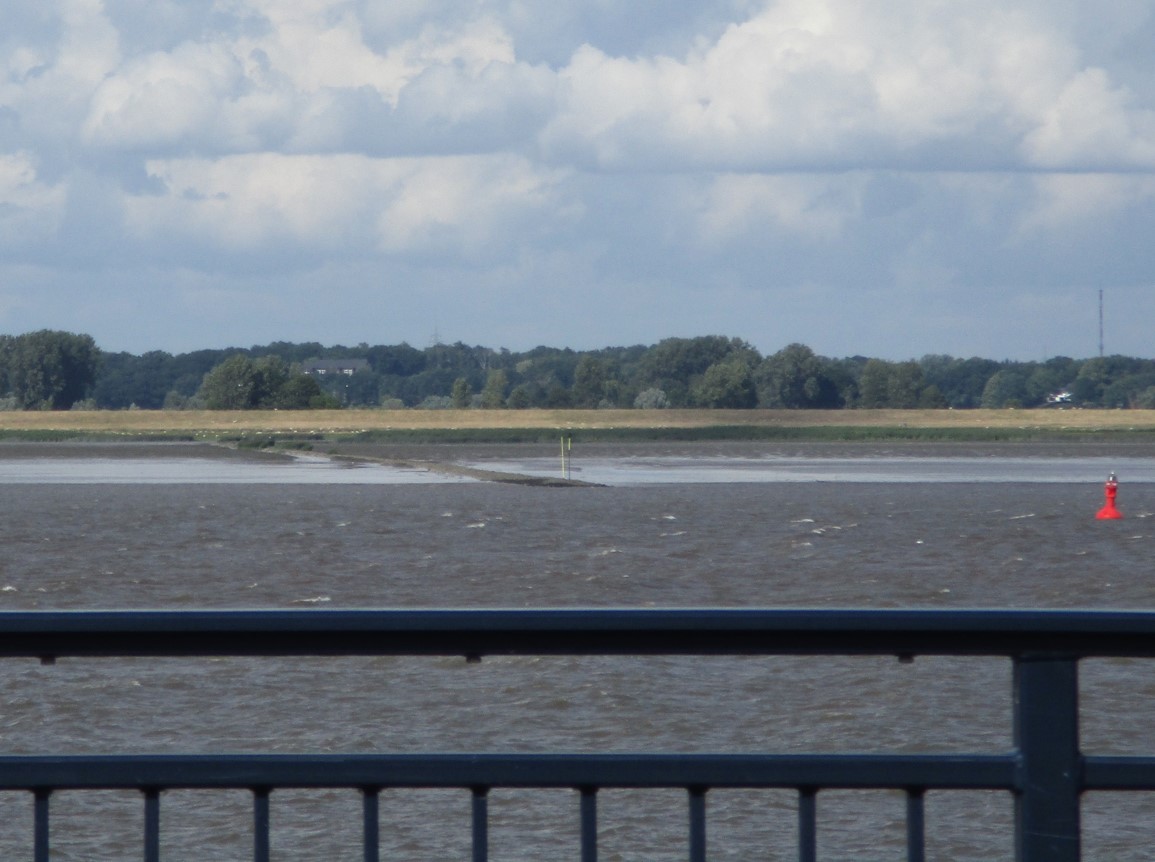 Blick vom Lühesperrwerk auf die andere Elbeseite – die lange Buhne auf dem Süßwasserwatt vor Fährmannssand, hart am Fahrwasser.