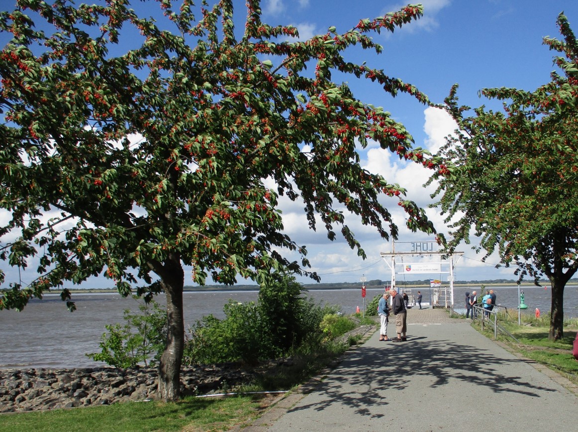 Elbdeich voraus, eine Apfelplantage durchradelnd. – In Wedel scheint`s zu schütten.