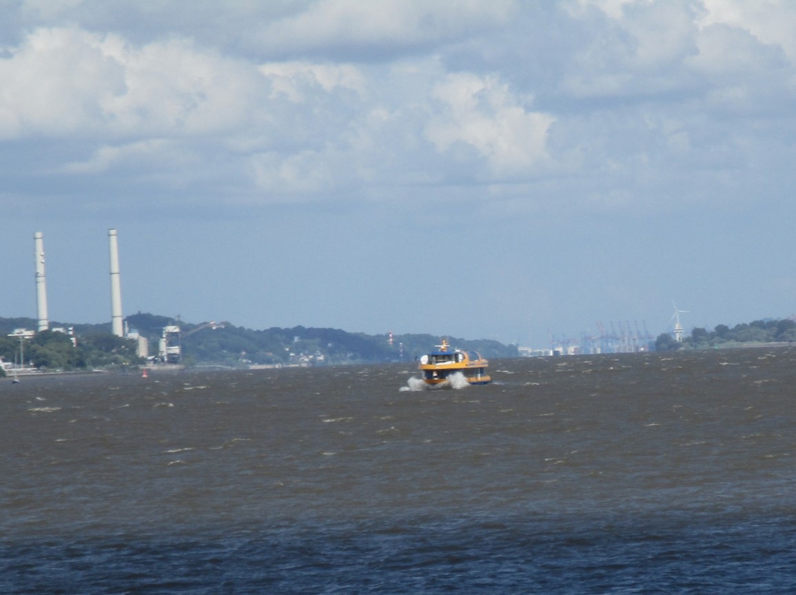 Da kommt, mit ablaufendem Wasser gegen den Wind, die Lühe-Schulau-Fähre.