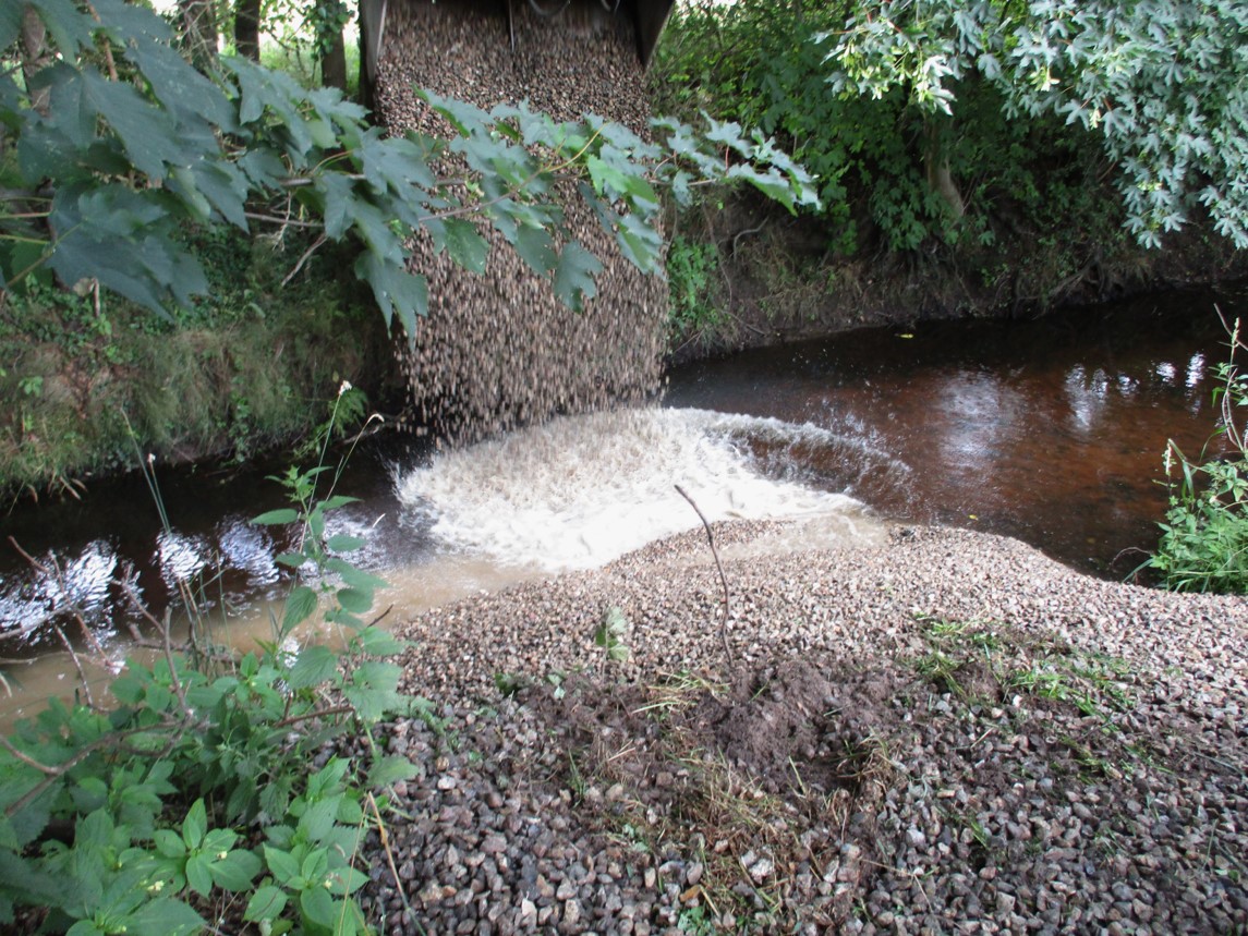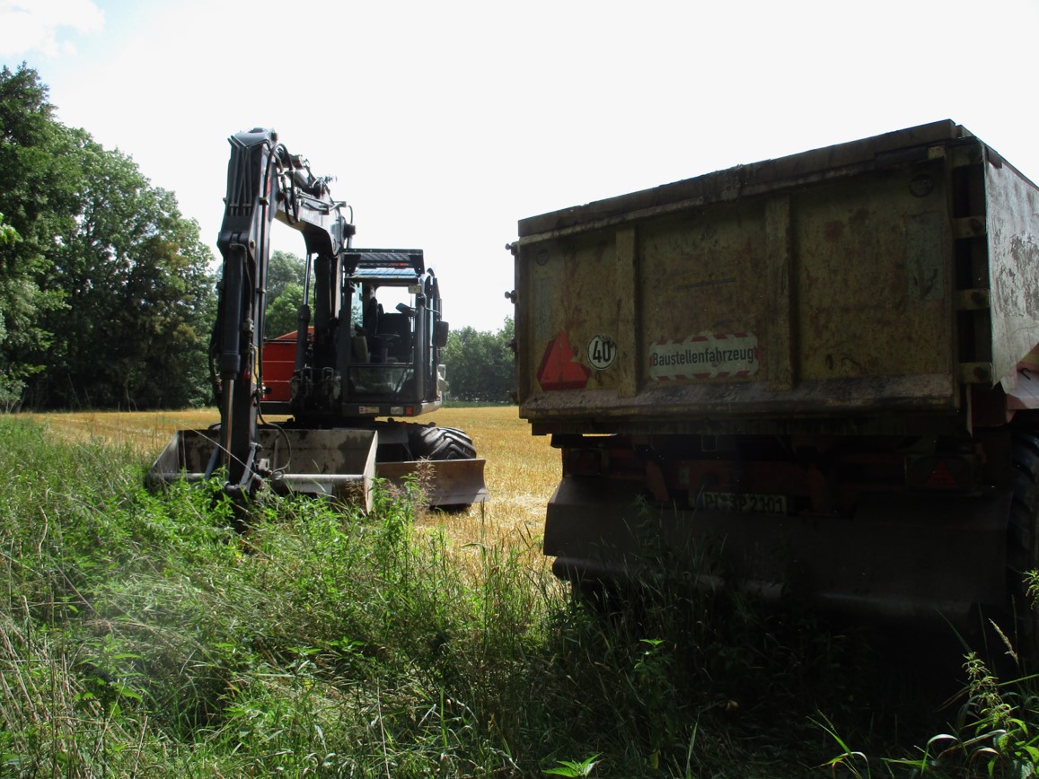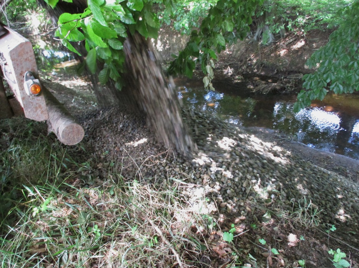 Angesichts dieser extremen Verhältnisse schütten wir per Dumper direkt am diesseitigen Ufer in den Bach.