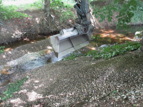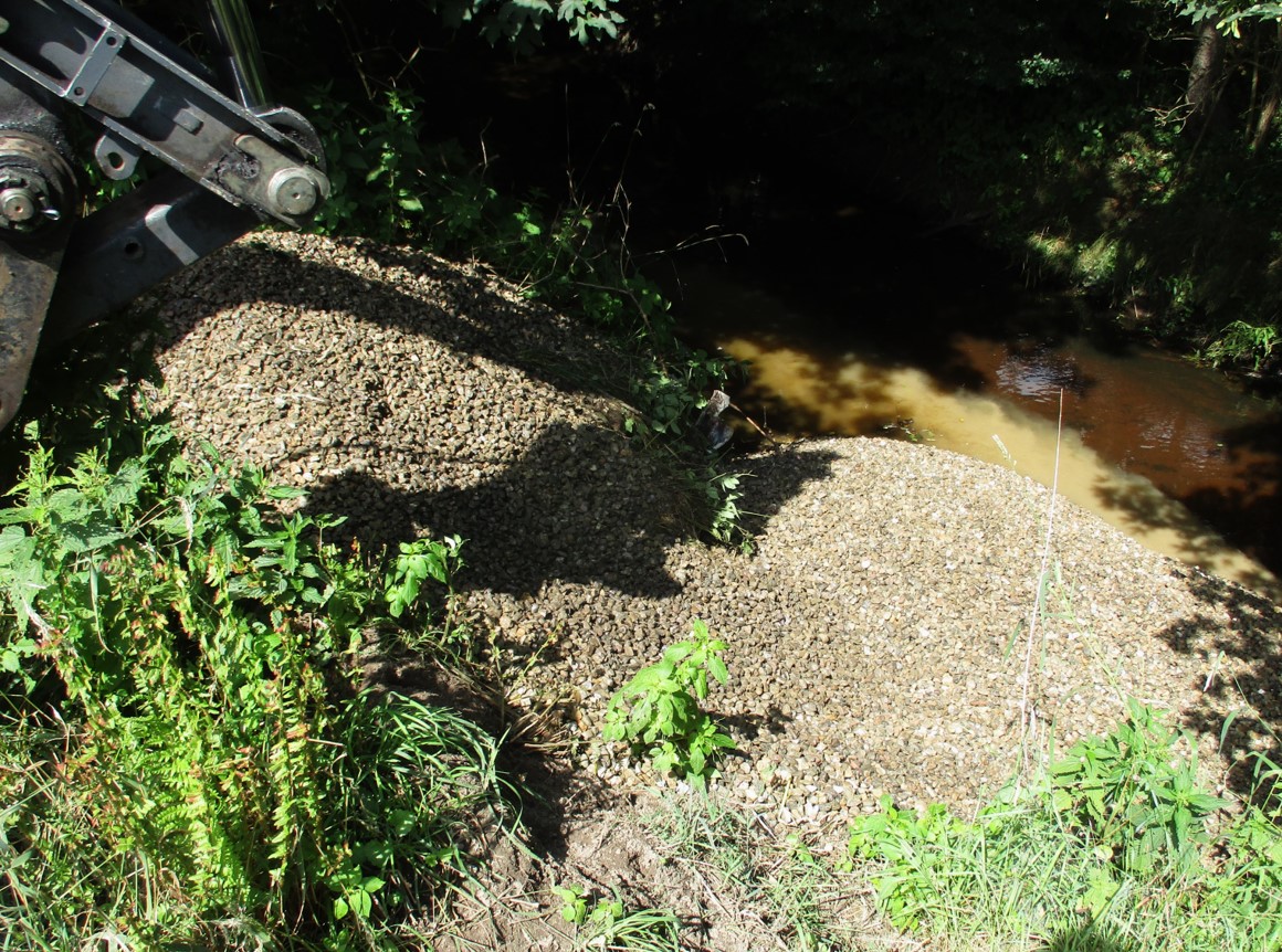 Hilfsweise schiebe ich am oberen und unteren „Insel“ende reichlich Kies ins Ufer, so dass keine Umströmung stattfindet. Die Fläche zum Kiesdepot ergänze ich mit Material von dort. Auch hier liegt nun eine Rausche.