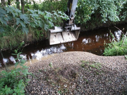 Das klappt man so gerade, reicht aber, Uferschutz auch am anderen Ufer anzulegen und eine Sohlgleite, Rausche, zu formen.