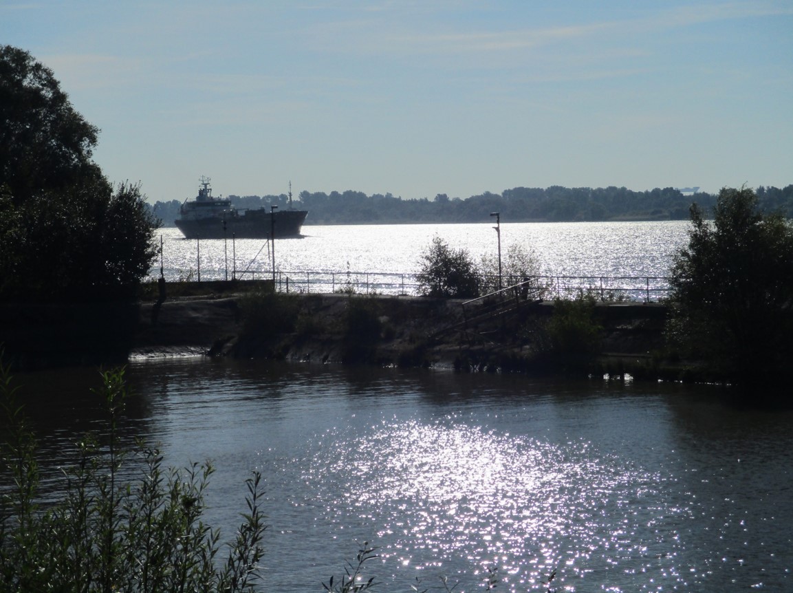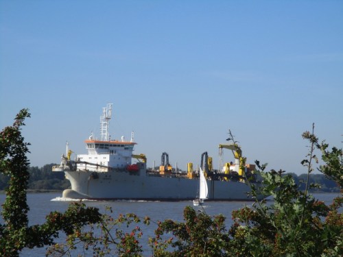 Auf der Elbe begegnet der Segler dem Groß-Hopperbagger Kaischuu. Der baggert innerhalb der Hamburger Hafenbecken und verklappt sein „Gut“ in der Nordsee. [Dazu schreibe ich heute mal nichts.]