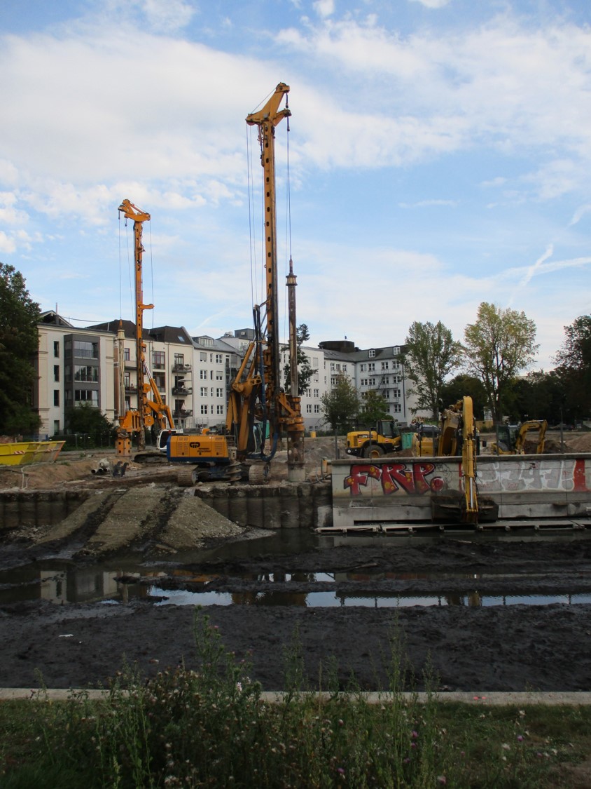 Die Wasserfläche des Hafens ist beidseitig abgespundet, entleert für die Zeit der Bauaktivitäten. Pfahlgründung ist gegenwärtig das Hauptthema.