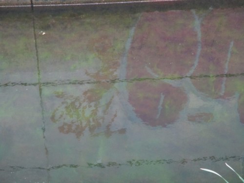 Farbspiegelung, violett, und Fadenalgen im stillen Flachwasser, grün.