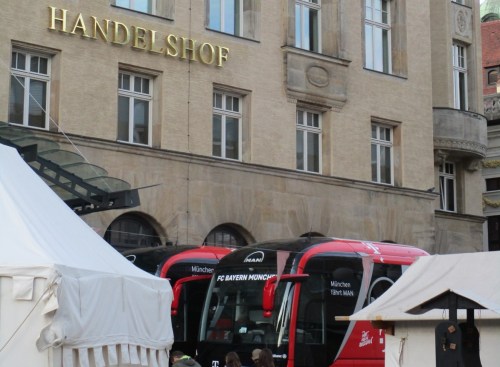 Rote Busse Bayern München vor dem Handelshof – das Spiel wird 2:2 ausgehen.