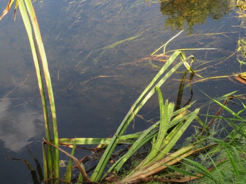 Der Kiesbach Parthe in seinem heutigen Vergewaltigungszustand: flächig bedeckt Schlamm den Gewässergrund, Schwimmblatt- und Sumpfpflanzen dominieren belichtete, überwärmte Bereiche.